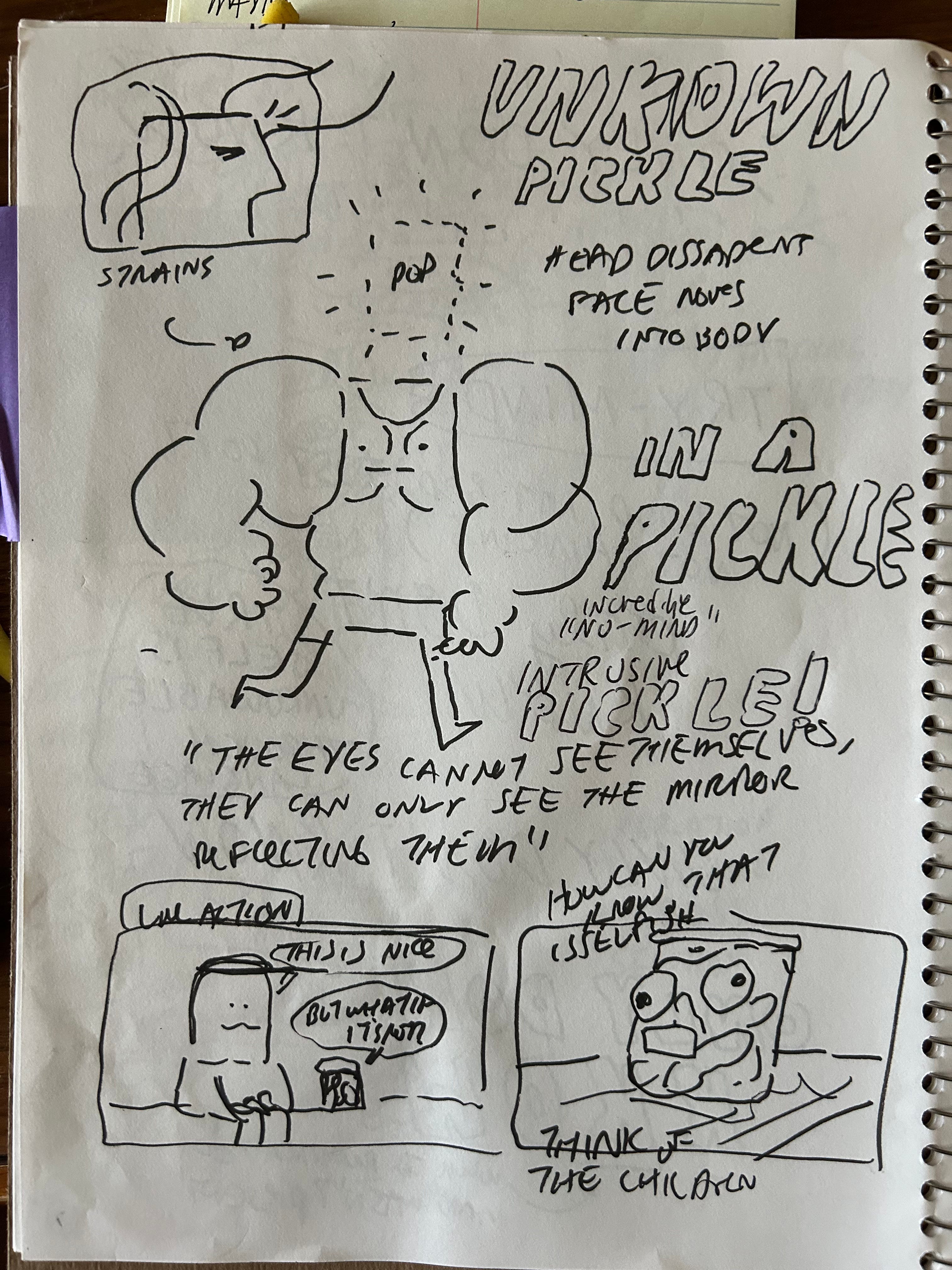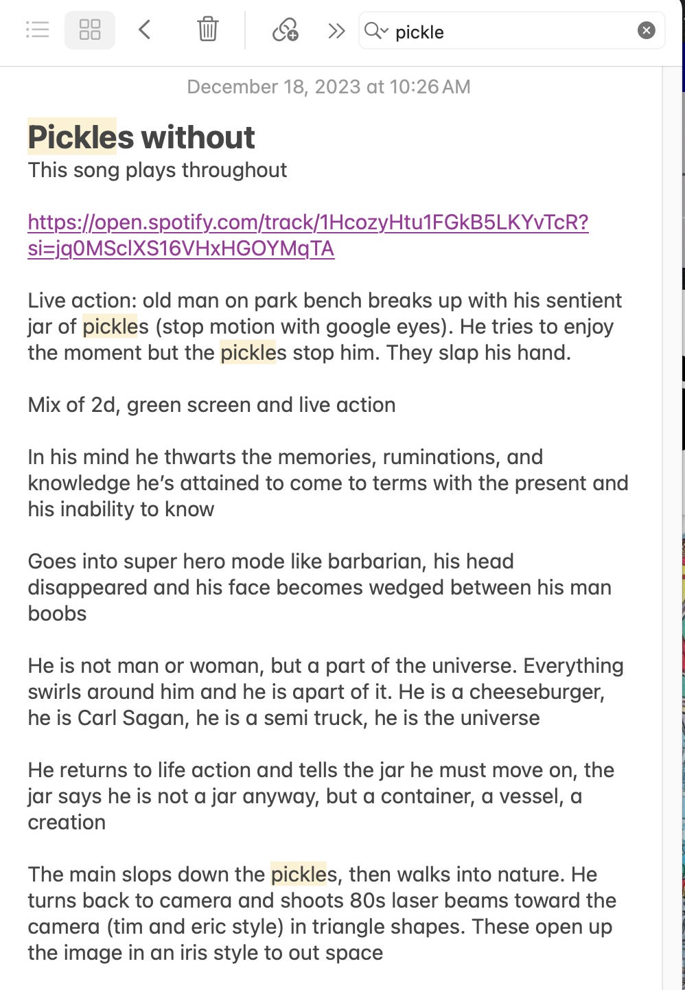 My sweet precious nature sounds were interrupted by a nearby gun range. Birds chirping are interrupted by loud POP POP POP POPS. I put on a Spotify album of nature sounds to cover it up (this part is made up). I don’t usually listen to music while I hike, but this time, I put on the soundtrack to Koyanasquatsi by Philip Glass (PRETENTIOUSNESS ALERT). Suddenly, I became flooded with images, ideas, lines of dialogue, and music for a short all figured out. It was going to be about a man breaking up with a sentient jar of pickles that he believes to be his own mind. OF COURSE IT WOULD BE!