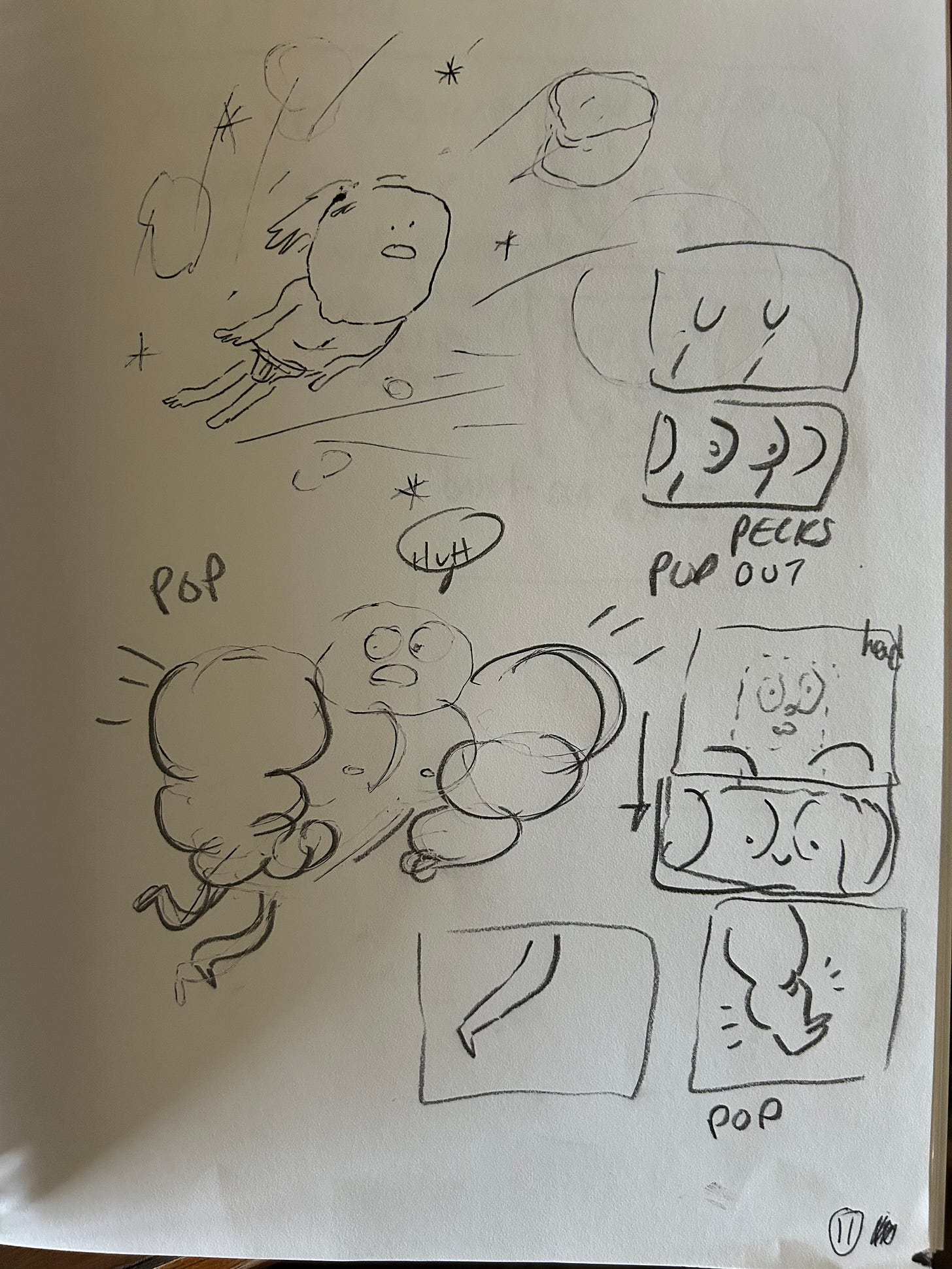 Three weeks of hyperfocus and perseveration set in, “How’m I going to make this with such a low budget? It’s due soon. I need to cut things—ok, this one’s not going to be mixed media; it’s going to be done with some digital tools I already have. Where are my car keys? Who am I? What is my purpose in life? God, why have you forsaken me?” My kids stared at me, not knowing what to say (made up). I quickly jotted down some characters. Usually, my process here is to draw a bunch of semi-similar versions of a drawing without thinking. Another tourretic thing I do; it’s almost like it’s not me drawing the thing. It’s intuitive. I can’t explain it. I try not to worry about it too much. I eat lots of junk food, I pace around my house talking in the character’s voices out loud, I notice a neighbor in the window and get embarrassed, then, I write a crappy script based off of my notes app vomit. I say crappy because that’s the way it should be at this point; just a bunch of gibberish to go off of.